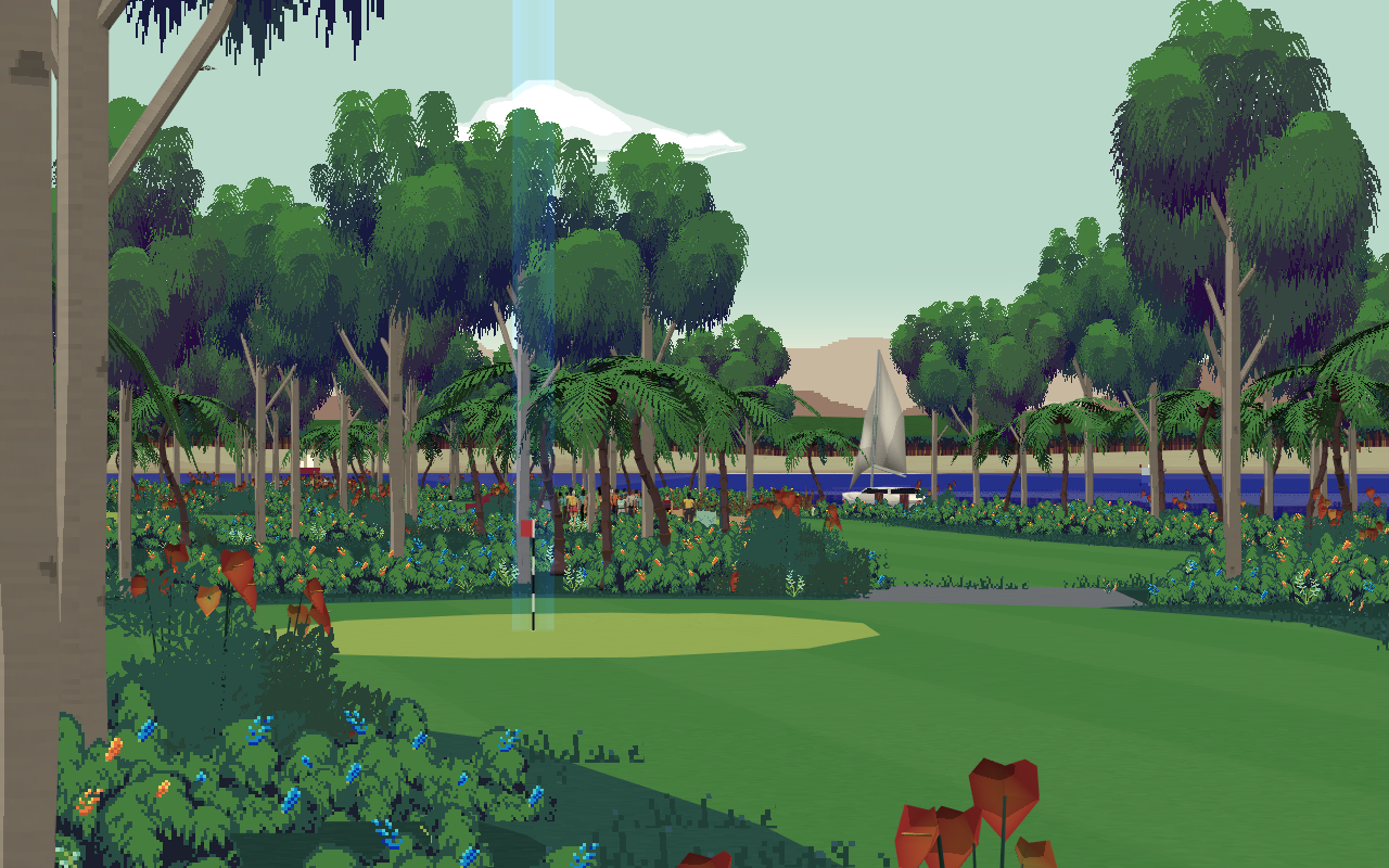 Elsewhere in the game I’ve taken Course 3 (Old Stemmer’s Lane) and given it a fresh lick of paint. Originally it was designed to have a more tropical feel to it, but somehow got stuck with the placeholder trees I used when I was first creating the course. Those are now gone and have been replaced with tropical plants, butterflies, crabs… even a rowing boat, all hemmed in with a new sandy beach. The course itself is still the same, so global leaderboards are unaffected.